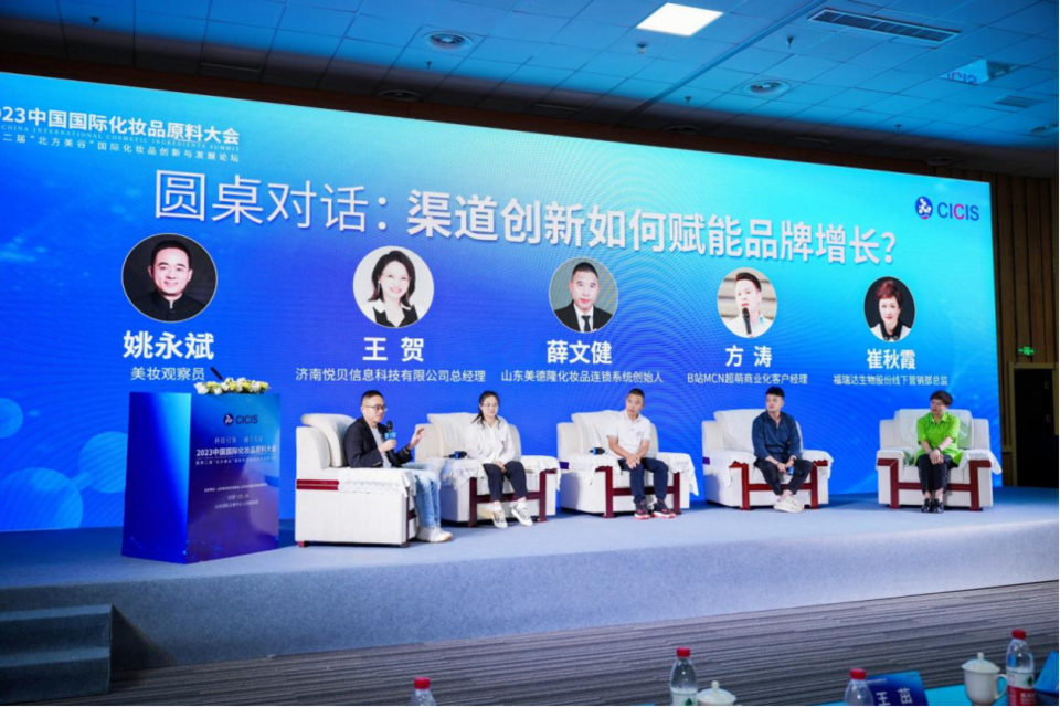 在“圓桌對話”環節,美妝觀察員姚永斌、濟南悅貝信息科技有限公司總經理王賀、山東美德隆化妝品連鎖系統創始人薛文健、B站官方MCN超萌商業化客戶經理方濤、福瑞達生物股份線下營銷部總監崔秋霞以“渠道創新如何賦能品牌增長”為主題展開討論,共同探索行業趨勢,發現渠道創新與品牌增長的方法論。